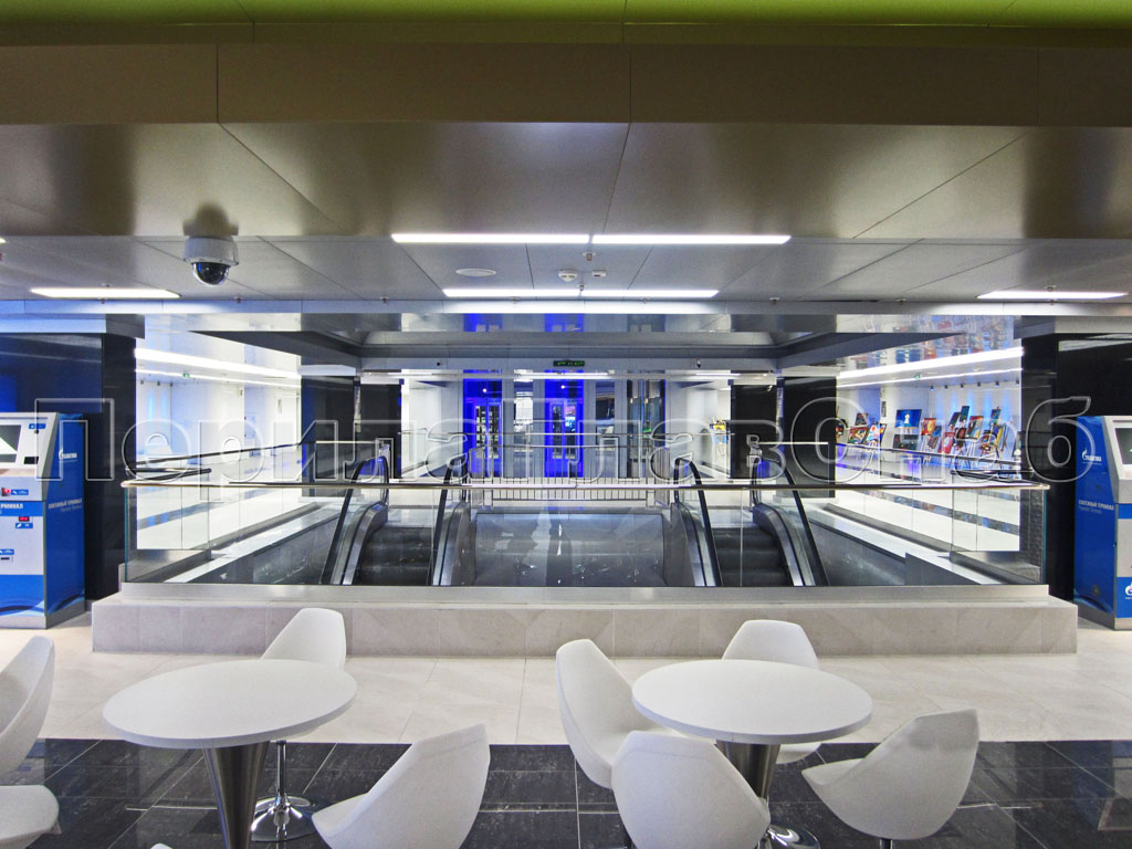 Несущее стекло для атриума установлено на алюминиевый анодированный профиль. Преимущества такого профиля в том, что он обладает зеркальным блеском, крепится на анкера и обладает огромной надежностью (выдерживает очень большие нагрузки и на разгиб). Для комфорта посетителей был использован поручень из трубы с пазом. Труба с пазом - идеальный поручень для несущего стекла,удобна в эксплуатации, а так же защищает кромку стекла.