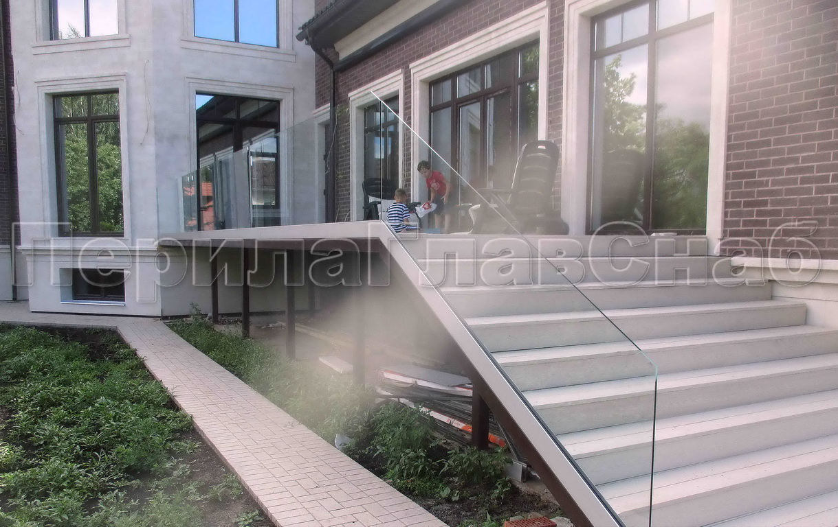 Стеклянные перила на несущем стекле на улице (для приусадебного участка)