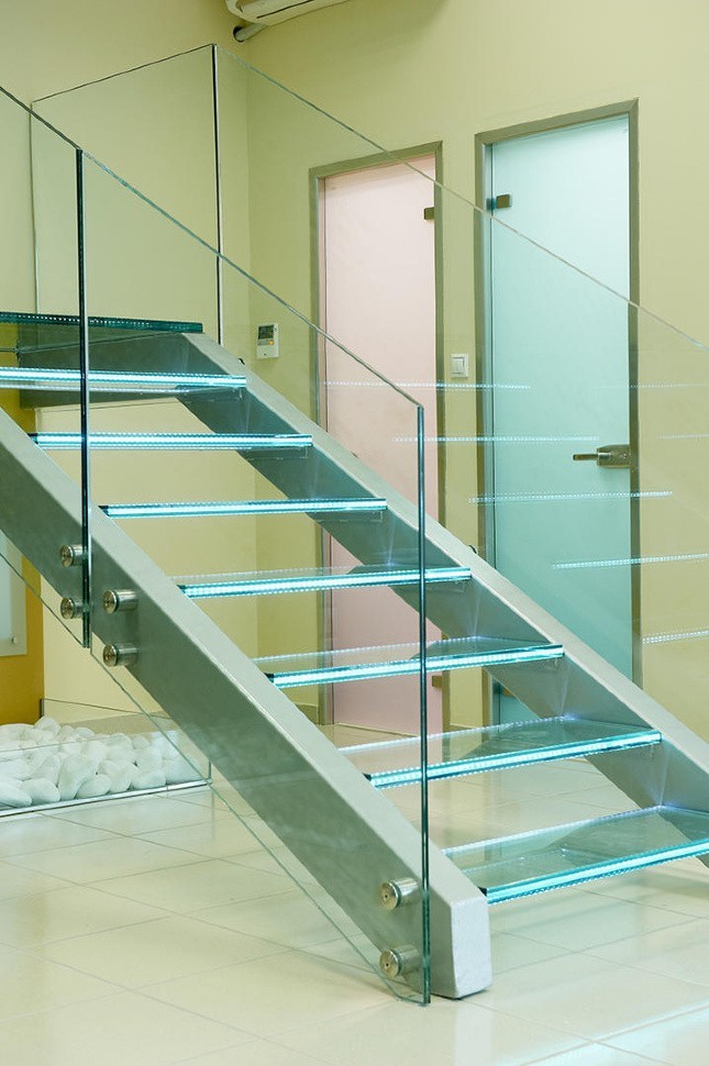 Стеклянные ступени на косоурной лестнице в доме в Воронеже. Готовые проекты ПерилаГлавСнаб - фото 1