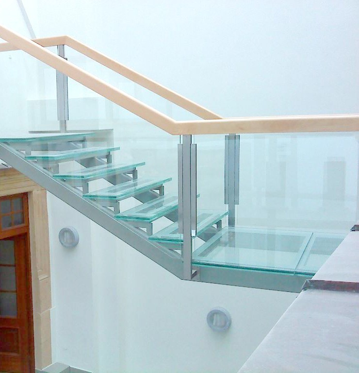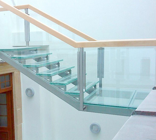 Стеклянные ступени и стеклянная площадка на лестнице