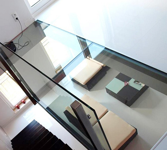 Стеклянное перекрытие из матового стекла на внутреннем балконе