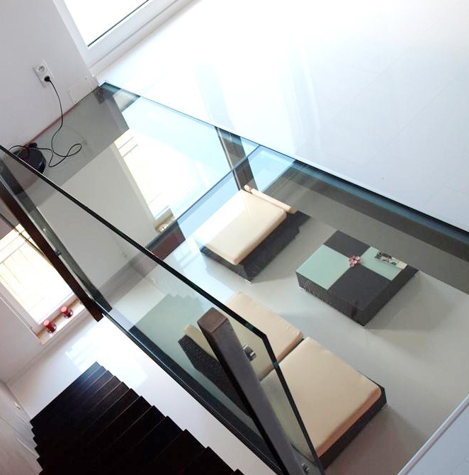 Стеклянное перекрытие из матового стекла на внутреннем балконе